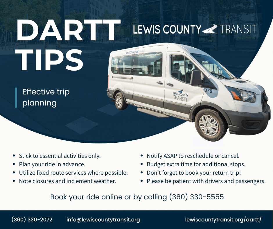 Much like our fixed route services, the demand for DARTT services will increase significantly during the holidays and through the winter. As we prepare, Lewis County Transit would like to offer a few reminders to help you plan your schedule.